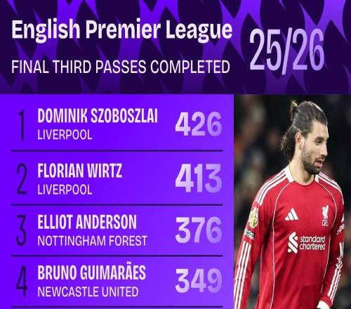 本赛季英超进攻三区成功传球排名:索博斯洛伊、维尔茨前二