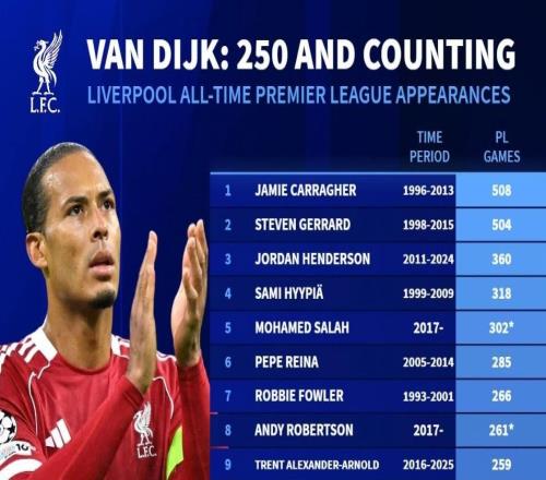 利物浦英超出场数TOP20:卡拉格508场第1,范戴克250场第11