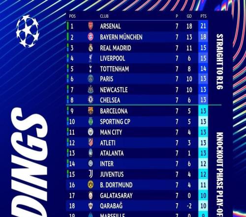 欧冠末轮半场后积分榜:曼城顶替切尔西进入前8,皇马第5巴萨第13