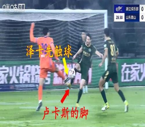 然而就在黄政宇进球之前,山东泰山一个疑似点球被吹。第26分钟时,泽卡在对手禁区内抢点,皮球击中浙江队外援后卫卢卡斯的手臂(上图)。