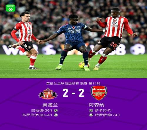 北京时间11月9日1:30,英超第11轮继续进行,阿森纳作客光明球场挑战桑德兰,本场主裁判为克雷格-鲍森。上半场,穆杰莱助攻巴拉德破门。下半场,梅里诺助攻萨卡扳平比分,特罗萨德世界波助阿森纳反超;补时阶段,布罗贝伊高难度凌空破门绝平。最终,阿森纳客场2-2战平桑德兰,各项赛事十连胜遭终结。