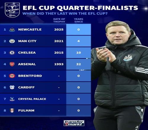 英联杯四分之一决赛将于本周打响,在此之际,德国转会市场列出了本赛季八强距离上次夺冠时间的榜单。