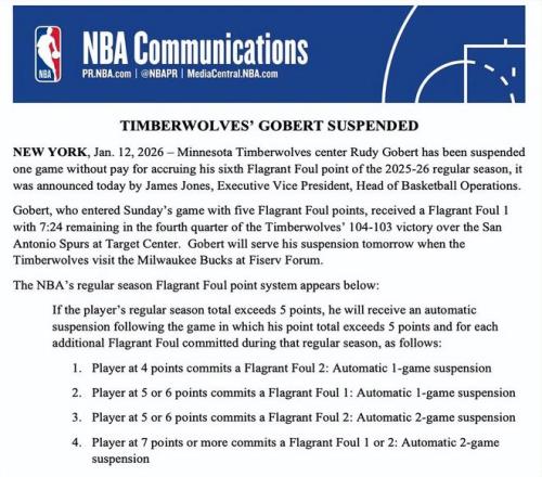 北京时间1月13日,NBA官方宣布,明尼苏达森林狼队中锋戈贝尔因在2025-26赛季常规赛中恶意犯规积分累计达到6分,将被无薪禁赛一场。此次禁赛将让戈贝尔损失201149美元的薪水。森林狼队也将因此获得100575美元的奢侈税差额抵免。